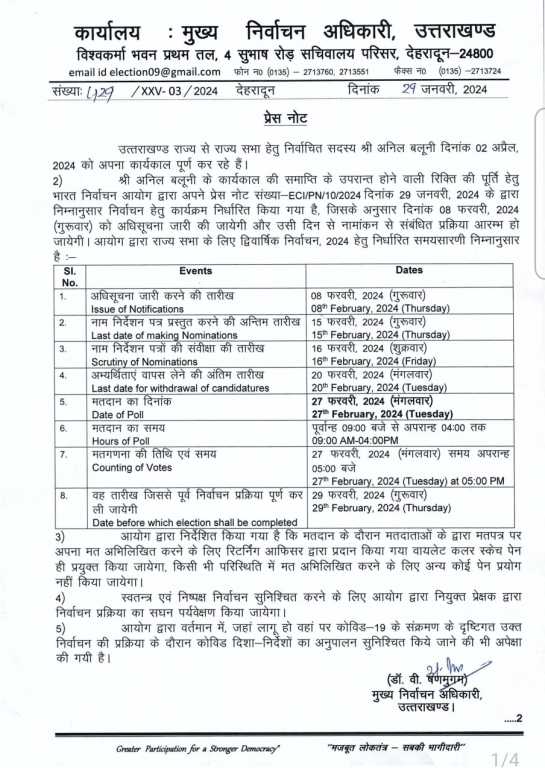 देहरादून। देश के 15 राज्यों की 56 राज्यसभा सीटों पर चुनाव का ऐलान हो गया है। इन सभी सीटों पर 27 फरवरी को मतदान होगा।भारत निर्वाचन आयोग (ECI) की ओर से सोमवार को यह घोषणा की गई। 13 राज्यों के 50 राज्यसभा सदस्यों का कार्यकाल 2 अप्रैल को समाप्त होने वाला है, जबकि 2 राज्यों के शेष 6 सदस्य 3 अप्रैल को रिटायर्ड हो जाएंगे। जिन 15 राज्यों में राज्यसभा चुनाव होने हैं उनमें उत्तर प्रदेश, महाराष्ट्र, बिहार, पश्चिम बंगाल, मध्य प्रदेश, गुजरात, आंध्र प्रदेश, तेलंगाना, राजस्थान, कर्नाटक, उत्तराखंड, छत्तीसगढ़, ओडिशा, हरियाणा और हिमाचल प्रदेश शामिल हैं। उत्तराखण्ड राज्य से राज्य सभा हेतु निर्वाचित सदस्य अनिल बलूनी दिनांक 02 अप्रैल, 2024 को अपना कार्यकाल पूर्ण कर रहे हैं। अनिल बलूनी के कार्यकाल की समाप्ति के उपरान्त होने वाली रिक्ति की पूर्ति हेतु भारत निर्वाचन आयोग द्वारा अपने प्रेस नोट संख्या-ECI/PN/10/2024 दिनांक 29 जनवरी, 2024 के द्वारा निम्नानुसार निर्वाचन हेतु कार्यक्रम निर्धारित किया गया है, जिसके अनुसार दिनांक 08 फरवरी, 2024 (गुरुवार) को अधिसूचना जारी की जायेगी और उसी दिन से नामांकन से संबंधित प्रक्रिया आरम्भ हो जायेगी। राज्यसभा के जिन सांसदों का कार्यकाल अप्रैल में समाप्त होने वाला है, उनमें 9 केंद्रीय मंत्री भी शामिल हैं। इनमें भाजपा अध्यक्ष जेपी नड्डा (हिमाचल प्रदेश), रेलवे, आईटी व संचार मंत्री अश्विनी वैष्णव (ओडिशा), आईटी राज्य मंत्री राजीव चंद्रशेखर (कर्नाटक), सूक्ष्म, लघु और मध्यम उद्यम मंत्री नारायण राणे (महाराष्ट्र), शिक्षा मंत्री धर्मेंद्र प्रधान (मध्य प्रदेश), स्वास्थ्य मंत्री मनसुख मंडाविया (गुजरात) और पर्यावरण मंत्री भूपेंद्र यादव (राजस्थान) हैं।