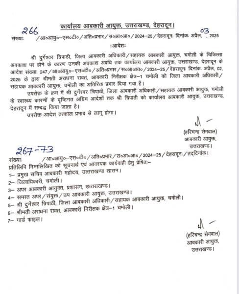 आबकारी आयुक्त हरिचंद्र सेमवाल द्वारा हस्ताक्षरित इस आदेश की प्रति आबकारी सहायक सचिव, उत्तराखंड शासन, चमोली जिला अधिकारी, अपर आबकारी आयुक्त प्रशासन, तथा अन्य संबंधित अधिकारियों को भेजी गई है। आदेश तत्काल प्रभाव से लागू कर दिया गया है।